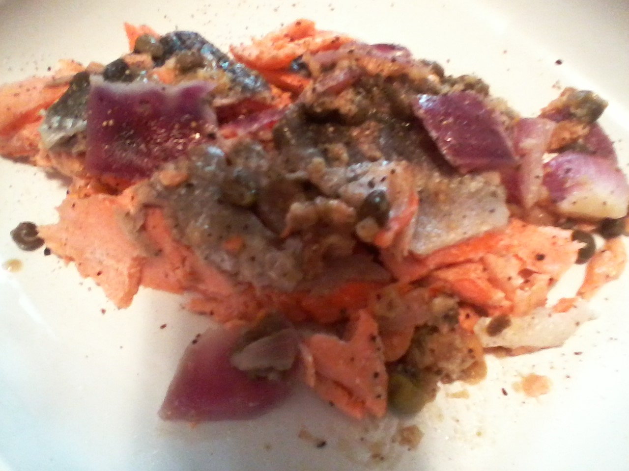 Wild, line caught Alaskan salmon (WFC), steamed in a day-old reduction of the juices of organic broccoli, green peas, and Hilary’s Root Veggie patty, splashed w/ white vinegar, adding capers and sliced red onion; after five +? or so minutes, removed filet from pan and roasted for eight minutes at 450 o; then, poured the reduction lightly over the salmon. Liberally added freshly ground black pepper, and served. Wished you were here.